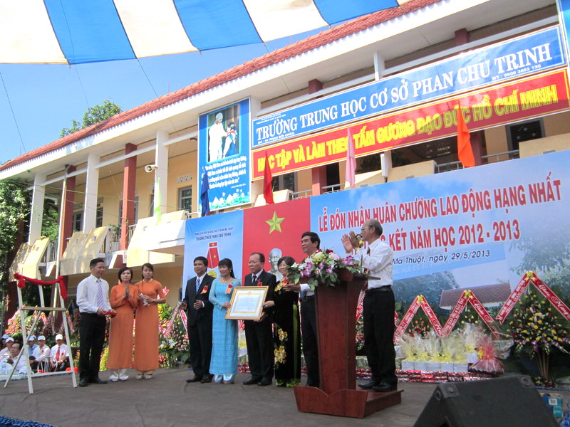 Ông Hoàng Trọng Hải- Phó Bí thư Tỉnh ủy, Chủ tịch UBND tỉnh Đắk Lắk trao Huân chương Lao động hạng Nhất cho Ban Giám hiệu trường THCS Phan Chu Trinh- TP Buôn Ma Thuột.